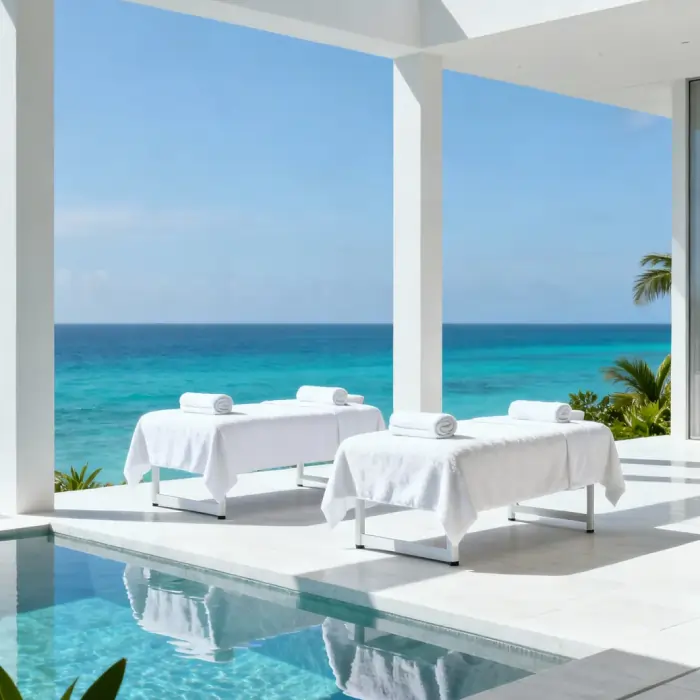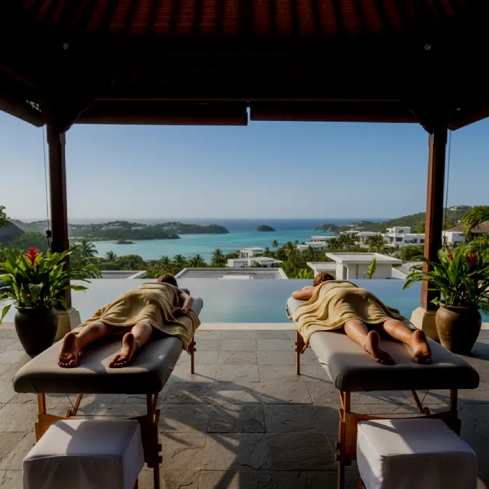 We set up in your hotel room or villa — just you two and the therapist team.